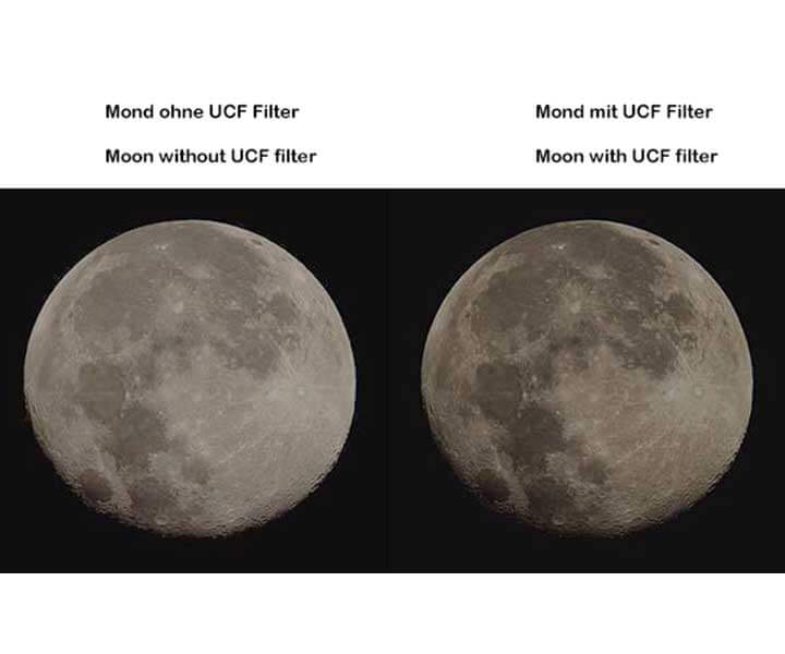 - Moon: the high brightness of the full Moon can cause eye discomfort and wash out fine surface detail. The UCF reduces glare significantly while increasing the contrast of craters, mountain ranges, rilles, and other surface features, without the strong color cast introduced by a standard neutral density Moon filter.